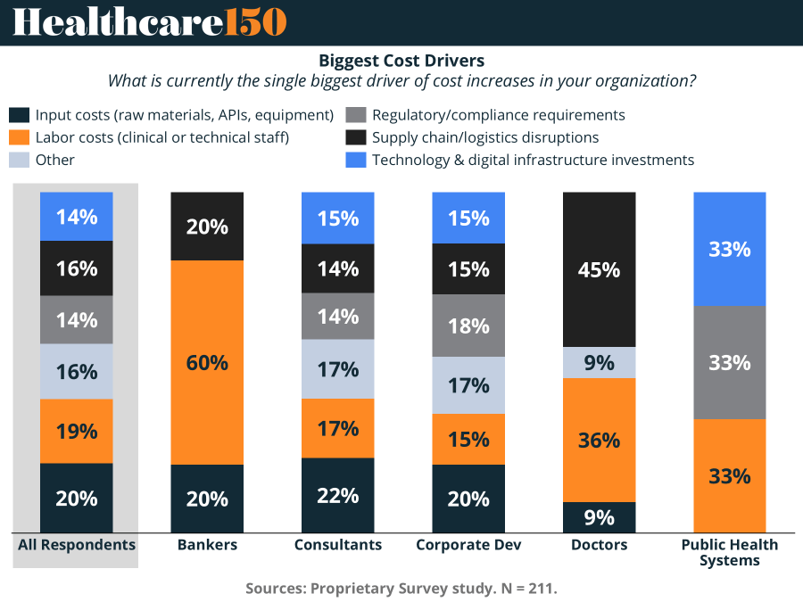 That said, differences matter. Doctors highlight supply chain (45%) and labor (36%), while bankers overwhelmingly point to labor (60%). Meanwhile, public health systems face a three-way pressure across labor, regulation, and technology (33% each). (More)