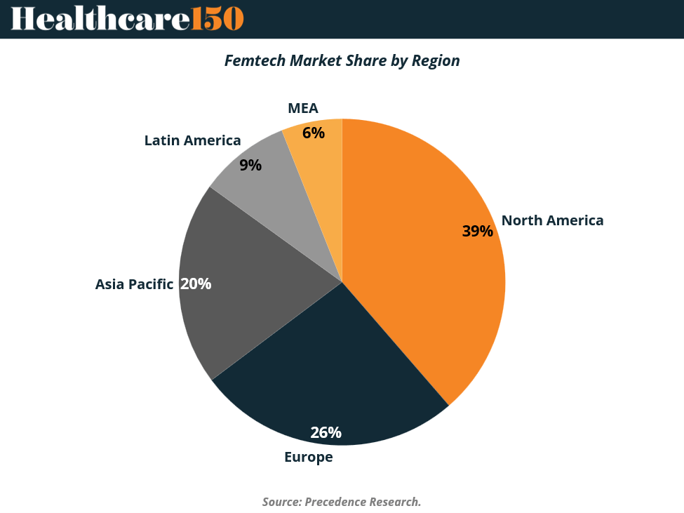 North America still calls the shots, controlling 39% of global femtech market share. That dominance isn’t accidental: high digital health adoption, clear reimbursement pathways, and a deep venture bench continue to fund solutions across fertility, pregnancy care, chronic disease, and menopause.