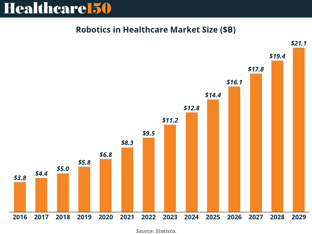 Healthcare robotics has quietly crossed the line from experimental capex to institutional infrastructure. The market is projected to grow 5.5x—from $3.8B in 2016 to $21.1B by 2029, signaling a strategic shift: robotics is no longer a speculative bet. It’s a necessity.