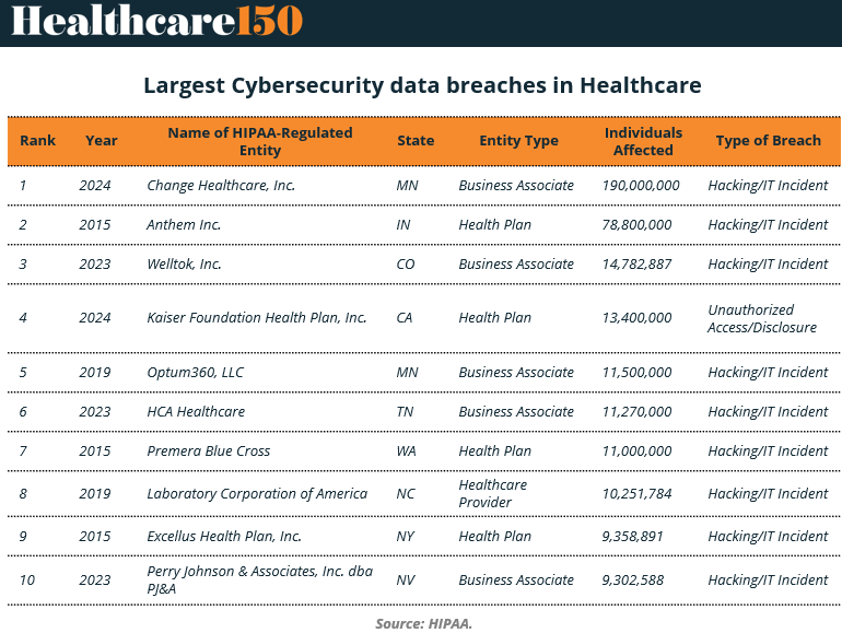 The top 10 healthcare data breaches in U.S. history—by number of individuals affected—tell a sobering story. Three of the top four happened in 2023–2024, with Change Healthcare’s breach alone compromising 190M records, more than half the U.S. population. Every breach in the top 10, except one, stemmed from Hacking/IT Incidents—a pattern too large to ignore.