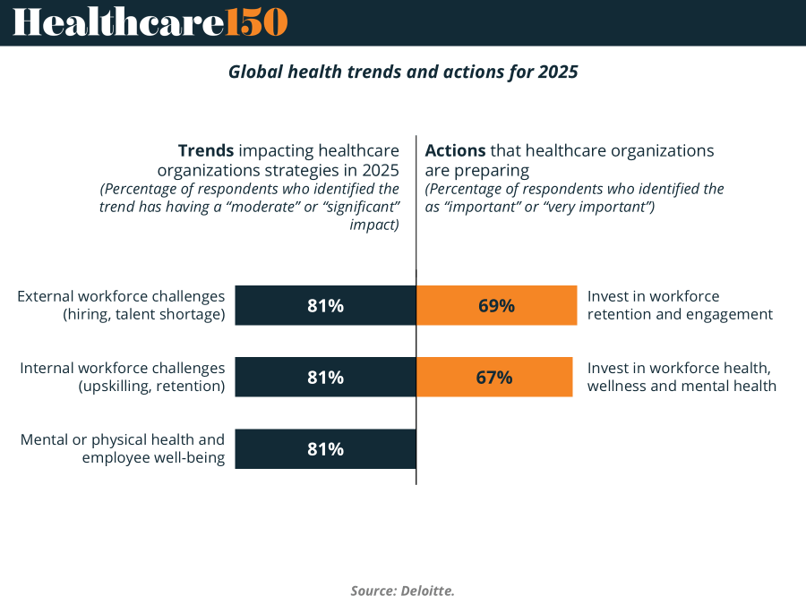 Digital transformation may grab the headlines, but in 2025, it’s talent that’s keeping healthcare executives up at night. A staggering 81% of providers cite hiring shortages, retention gaps, and upskilling issues as top threats to their strategy. But it’s not just about filling shifts—employee well-being is now boardroom-level urgency. With 69% of systems investing in engagement and 67% in mental health, organizations are learning that resilience starts with retention. The takeaway? If your people strategy isn’t keeping pace with your tech stack, your transformation is already in trouble. (More)