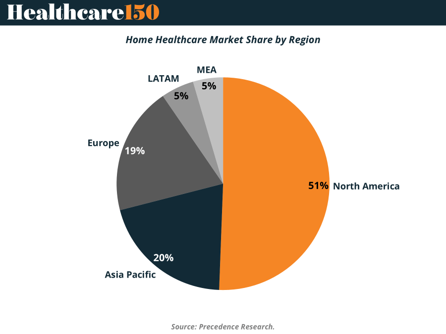 Meanwhile, Asia Pacific—already at 20%—is the fastest-growing region, propelled by aging populations and rising chronic disease loads. Europe holds 19% as hospital-at-home expands, while LATAM and MEA (each 5%) build from smaller but increasingly strategic bases. Global momentum is clear: home-based care is shifting from niche to necessity. (More)
