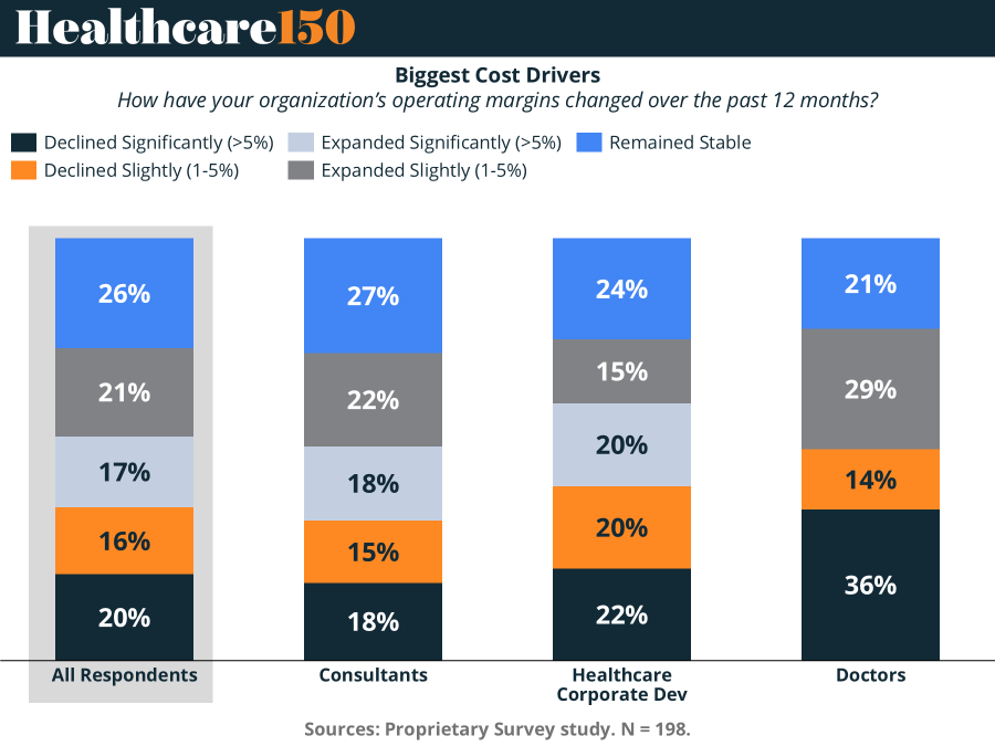 Doctors are carrying the most visible margin stress. Among physician respondents, 36% said margins declined significantly, by far the highest figure of any cohort in the survey. Another 14% reported slight decline, taking total contraction to 50%. Only 29% reported slight expansion, and just 21% said margins were stable. Notably, there is no visible meaningful share of doctors reporting significant expansion. That is a stark result. It points to a provider economy still squeezed by labor inflation, staffing shortages, rising non-clinical overhead, and reimbursement frameworks that do not move fast enough to absorb cost growth.