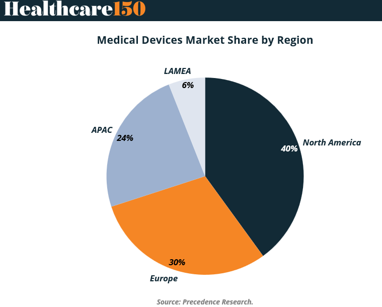 North America commands 40% of the global medical devices market—nearly double that of Asia-Pacific (24%) and far ahead of Europe (30%). While the U.S. remains the global epicenter of MedTech innovation, its lead is narrowing.