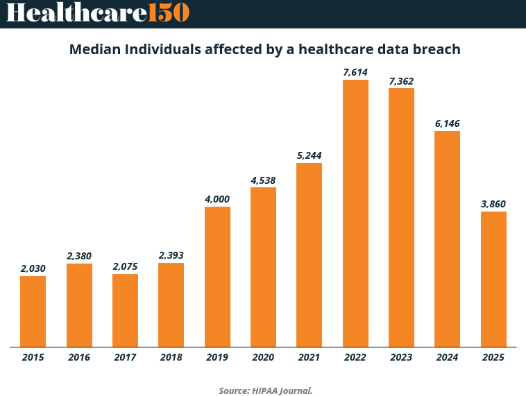 The median number of individuals affected per healthcare data breach dropped to 3,860 in 2025, down 49% from its 2022 peak of 7,614, per HIPAA Journal data.