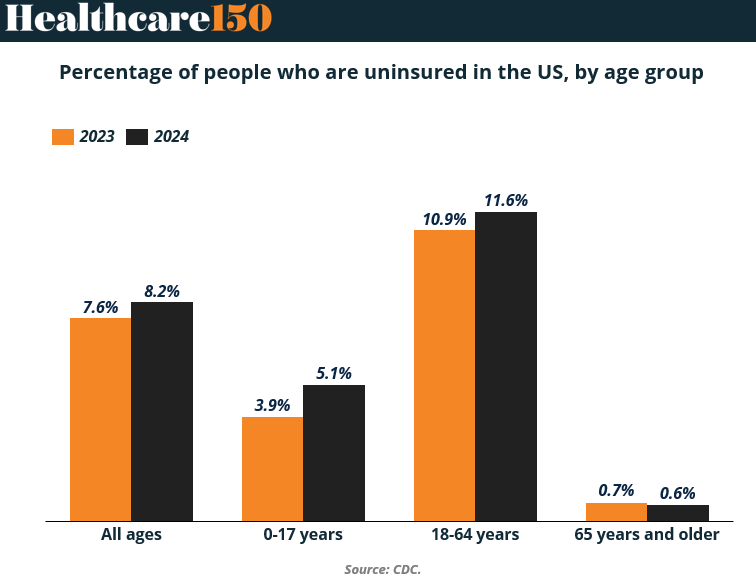 This uptick reverses a decade-long downward trend and reflects the aftershocks of pandemic-era policy rollbacks—especially the unwinding of Medicaid continuous enrollment. While the elderly remain largely covered (0.6% uninsured), the working-age and pediatric populations are slipping through the cracks.