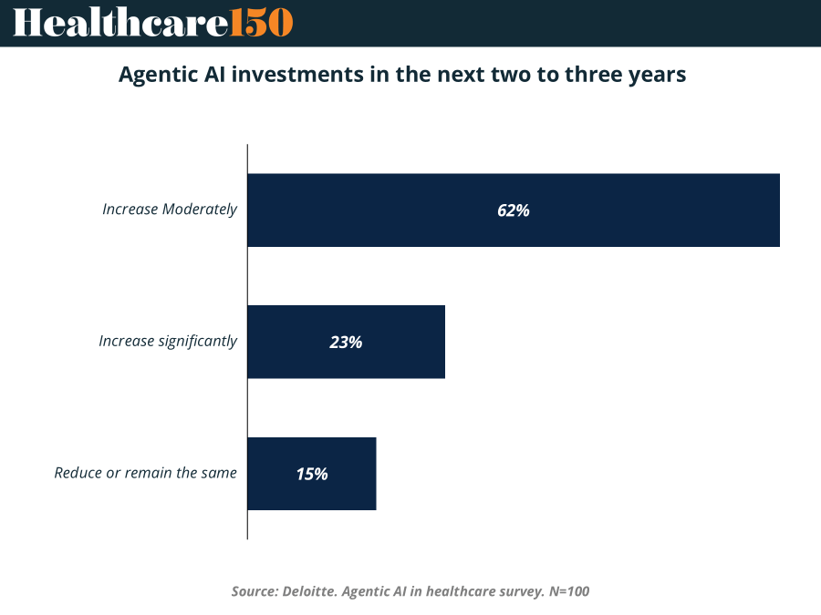 Healthcare executives expect meaningful investment in agentic AI, but the pace will be evolutionary rather than explosive. In a recent Deloitte survey of 100 healthcare leaders, 62% expect spending on agentic AI to increase moderately over the next two to three years, while 23% anticipate a significant increase. Only 15% expect spending to remain flat or decline.