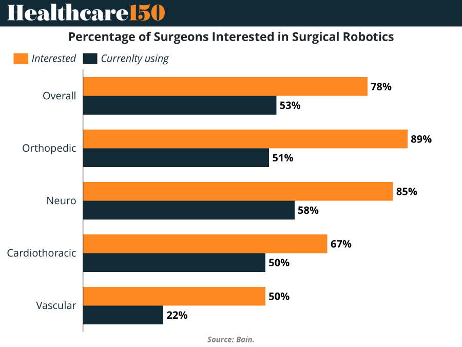 Orthopedic and neurosurgeons show the highest interest in robotics (89% and 85% respectively), but actual usage remains significantly lower (51% and 58%). Cardiothoracic and vascular surgeons lag further behind, with only 50% using robotic tools despite growing curiosity. This discrepancy suggests that while excitement around robotic capabilities is high, integration into surgical workflows still faces structural, financial, and training barriers.