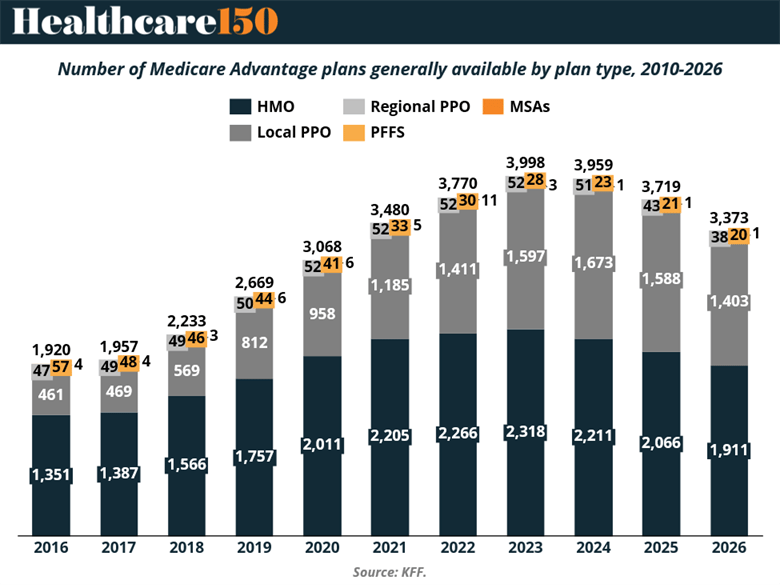 After years of expansion, Medicare Advantage plan supply is finally cooling. Total plans peaked at 3,998 in 2023, before falling to 3,373 in 2026—a clear shift from growth to rationalization.